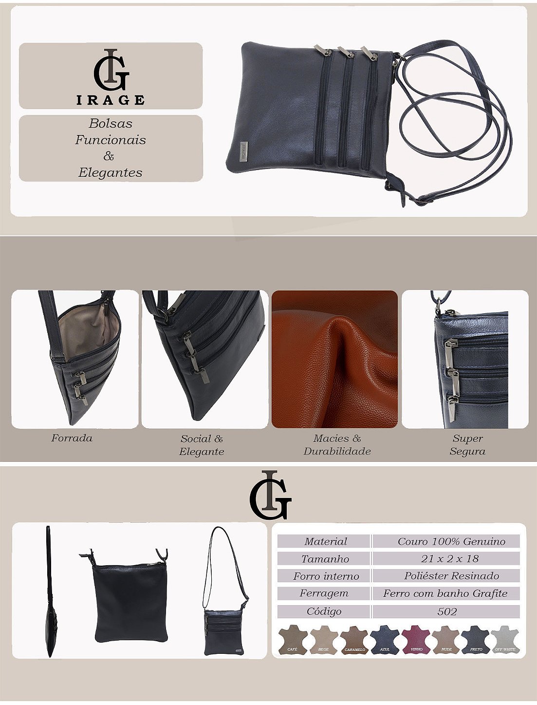 BOLSA FEMININA TRANSVERSAL COM BOLSOS FRONTAIS EM COURO 100% LEGÍTIMO
