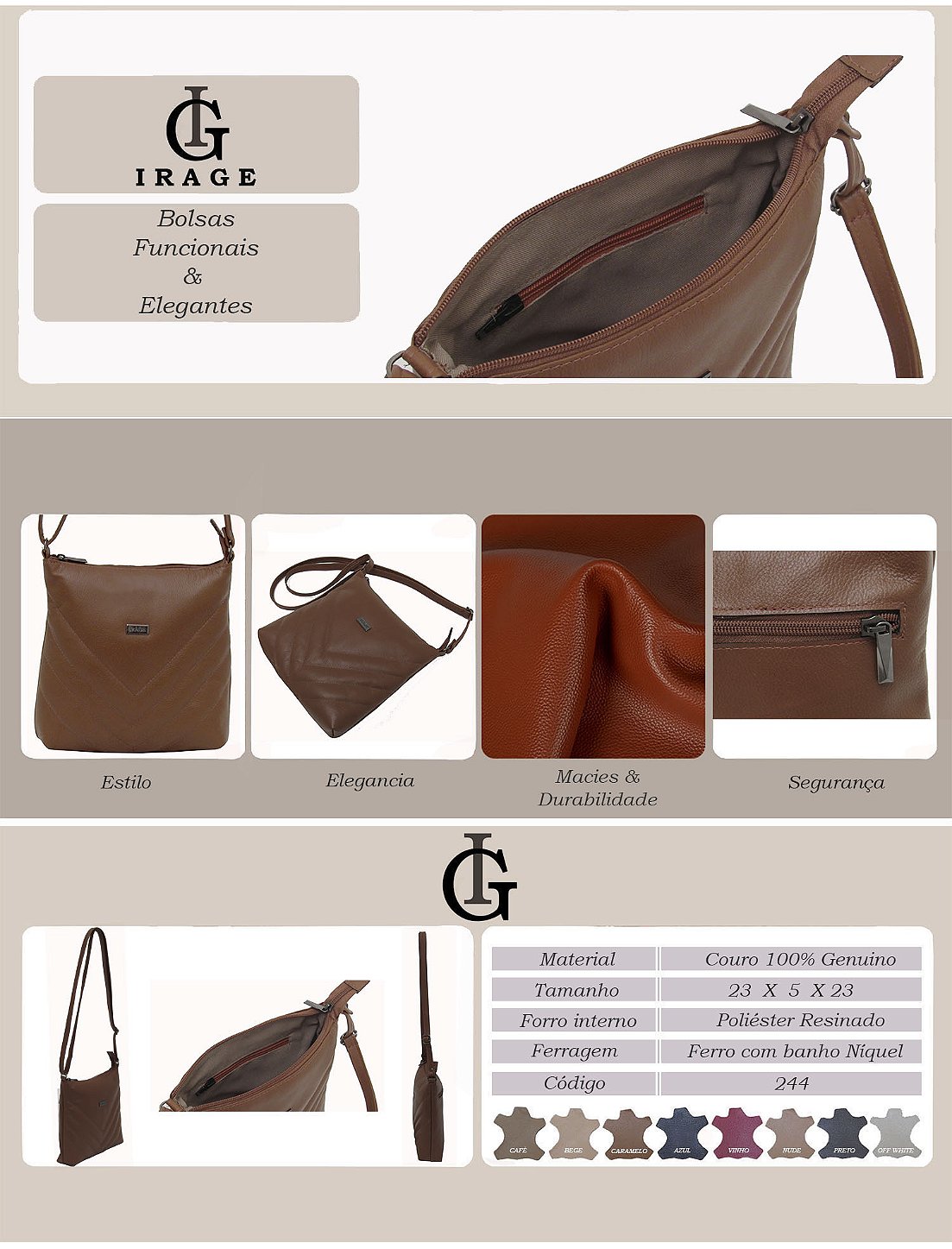 BOLSA FEMININA TRANSVERSAL COM ZÍPER FRONTAL EM COURO 100% LEGÍTIMO